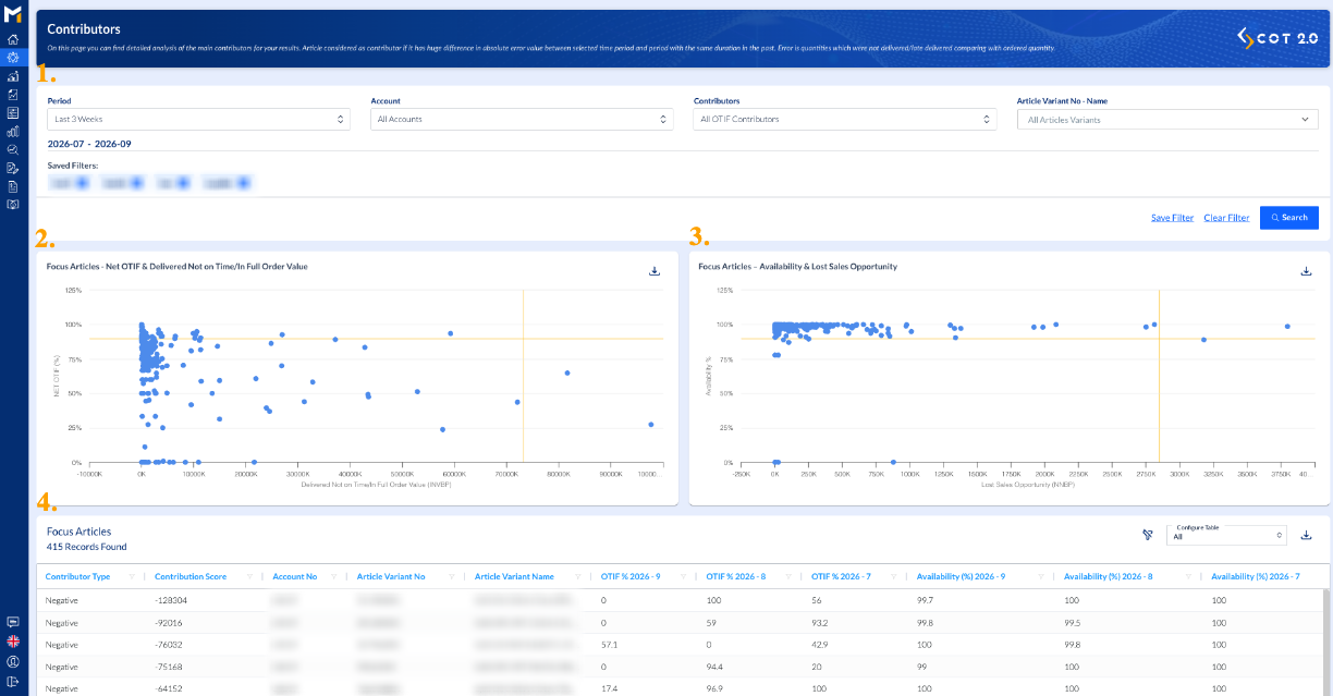 The "Contributors" section provides you with insightful information about your best performing articles and your most problematic articles in terms of OTIF. So Positive and Negative OTIF Contributors.