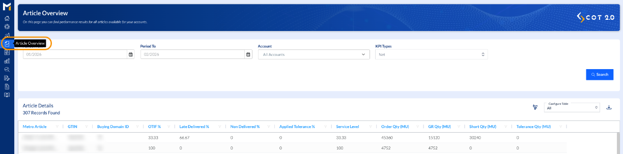 Compared to the Detailed KPI View on Home page, where you can see article-level information for the last 9 weeks, here in Article Overview you can go back and check historical data for as long as it is available in Metro systems. You can also customise the period for which to check this data. You will see the Net OTIF of articles ordered by Metro and delivered to them for the selected period (the articles with OTIF 100% included), as well as Late Deliveries and Non Deliveries in percentages. Ordered Quantities, Received Quantities, Short Quantities and Tolerance quantities are also shown in Metro Units (MU).